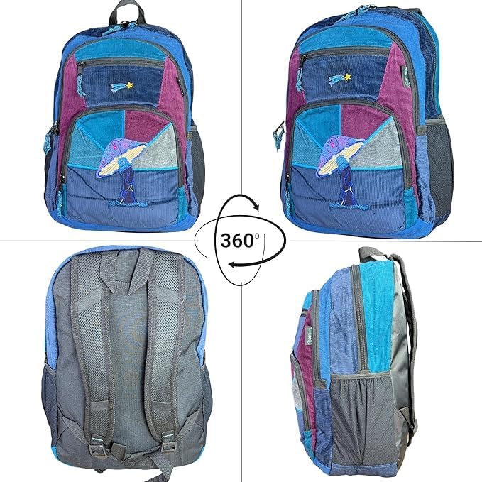 - Mushroom Embroidery on Corduroy – Features a detailed mushroom design embroidered directly onto colorful corduroy patchwork—each backpack has a bold, one-of-a-kind boho style.