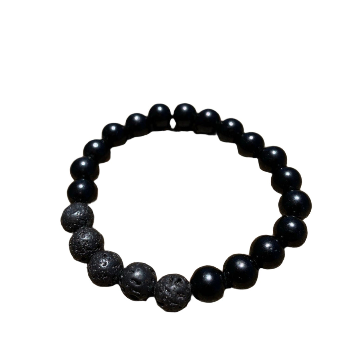 Features an elastic stretch band with lava rock beads and semi-precious blue sodalite gemstones. Each stone is unique and will vary - no guarantee to picture.