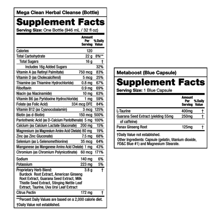 Mega Clean NT is similar to Mega Clean, but upleveled in several ways. First, we started with Mega Clean, and then re-formulated it with a lower-sugar flavor profile. And, the “NT” in Mega Clean NT stands for “No Time.” With the addition of the accompanying metabolic enhancing capsule, Metaboost, this is truly a one-day cleanse.