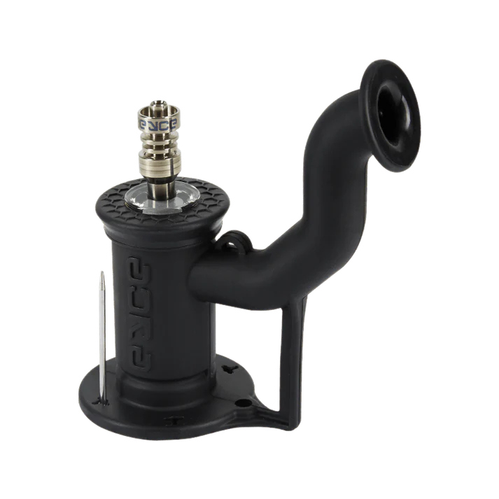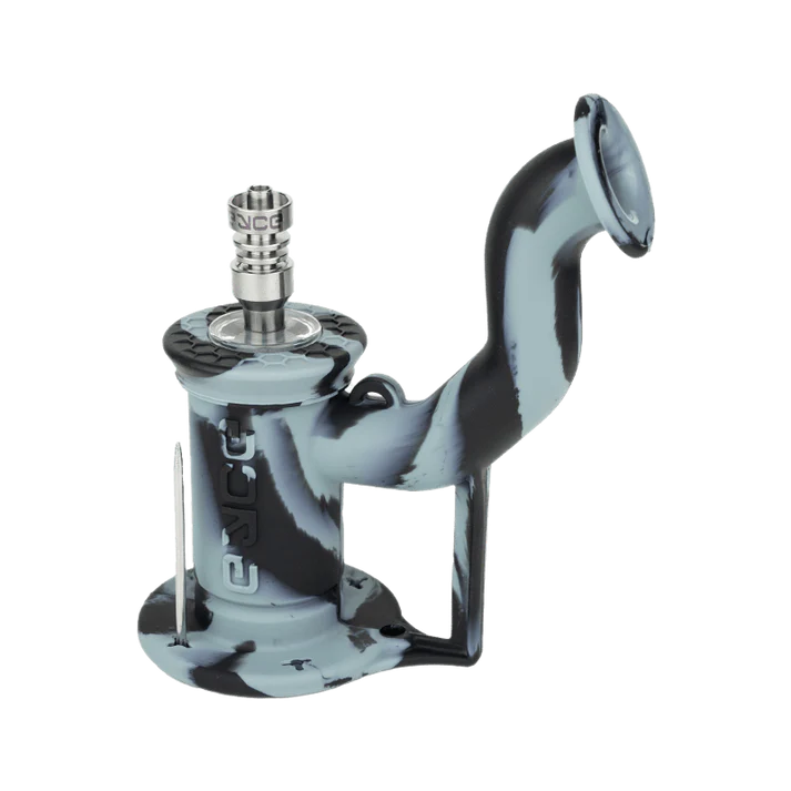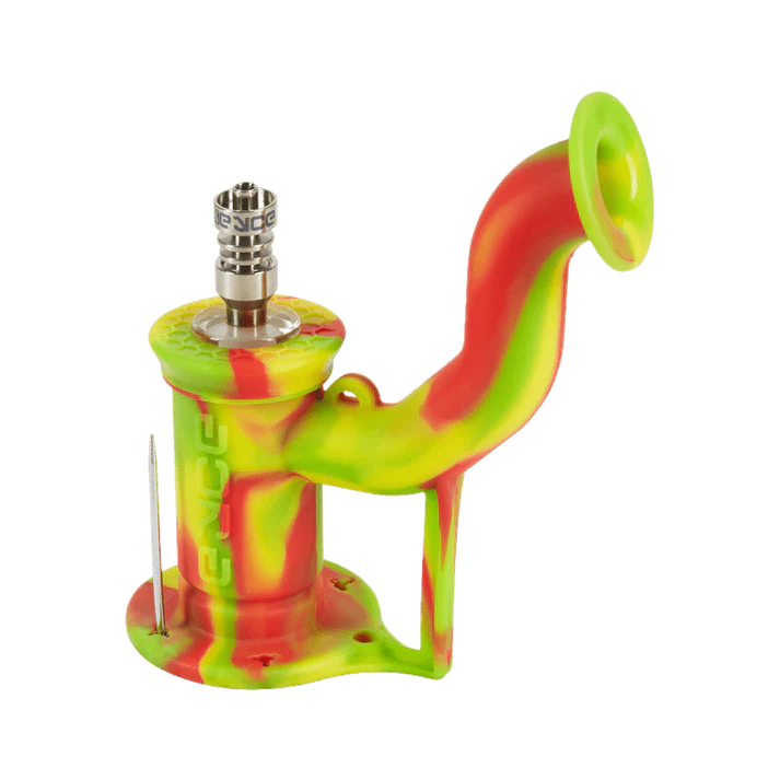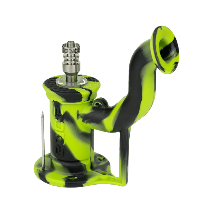 The Eyce Rig II is a sturdier upgrade to its predecessor. Constructed from Eyce’s classic platinum-cured silicone, the Eyce Rig II features a 10-millimeter borosilicate glass collar that holds the titanium nail and acts as a heat barrier. The reinforced chamber walls provide this virtually indestructible rig with additional stability.