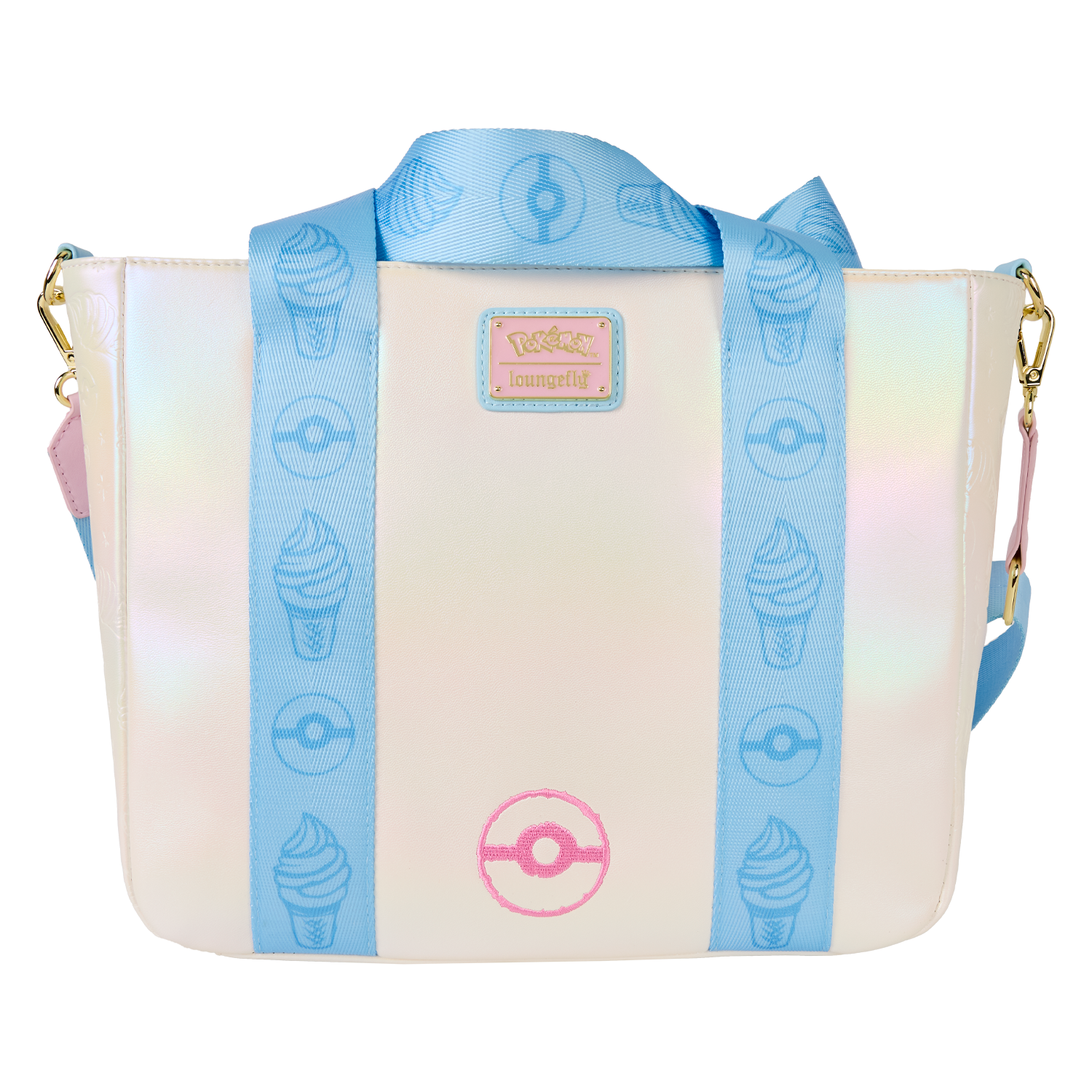 This tote bag features Pikachu embroidered front and center. All around and on the straps, you'll find designs of hearts, Poké Balls, and sweet treats! Attached to the crossbody strap is a coin bag that looks like a Poké Ball.