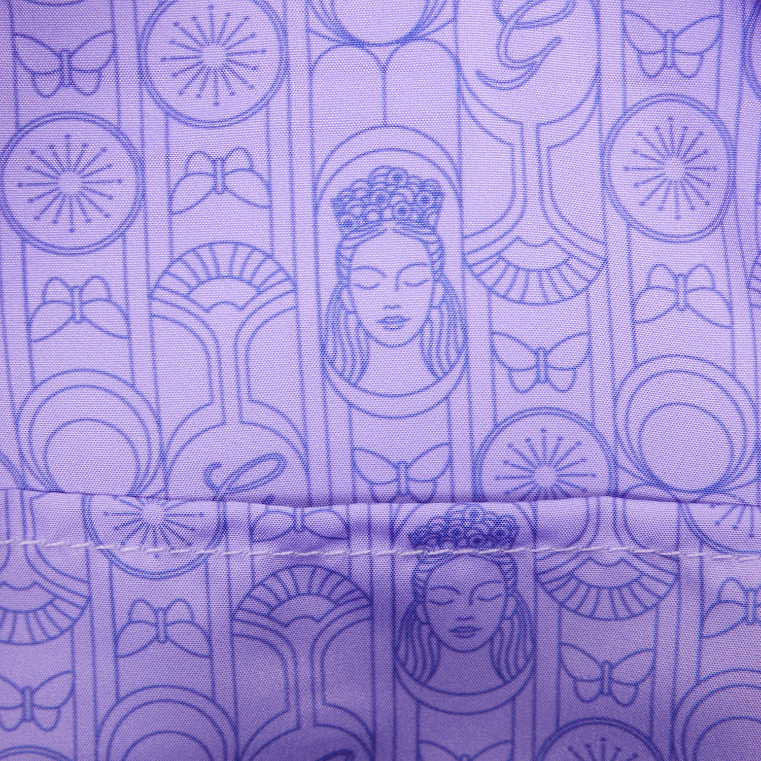 This gorgeous mini backpack features pearlescent faux leather with elegant details, including silver foil, rhinestones, and raised tonal embroidery. Over the front pocket, you'll find a clear PVC bubble with Glinda inside it! Butterflies and swirling designs cover the bag.