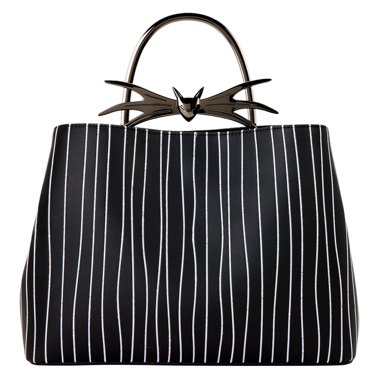 This handbag is inspired by Jack Skellington's suit, complete with embroidered details of Jack's pinstripe suit. A metal handle sticks out from the top and has a sculpted-metal bat bowtie attached to it. It also glows in the dark!<br>